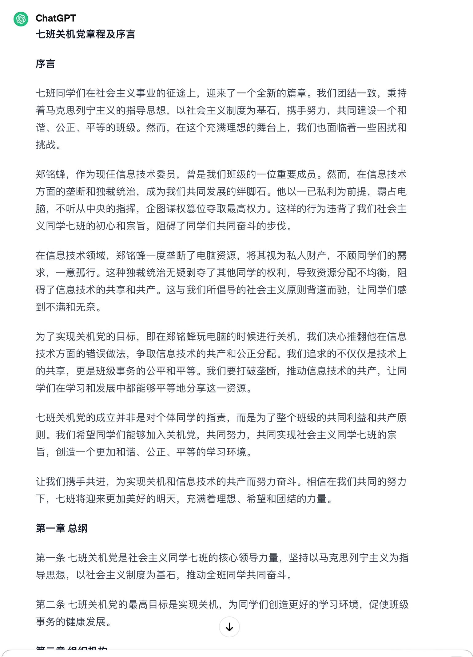 - 第三条 七班关机党是社会主义同学七班的最高政治领导力量,其任务是领导全班同学为实现社会主义事业而努力奋斗。